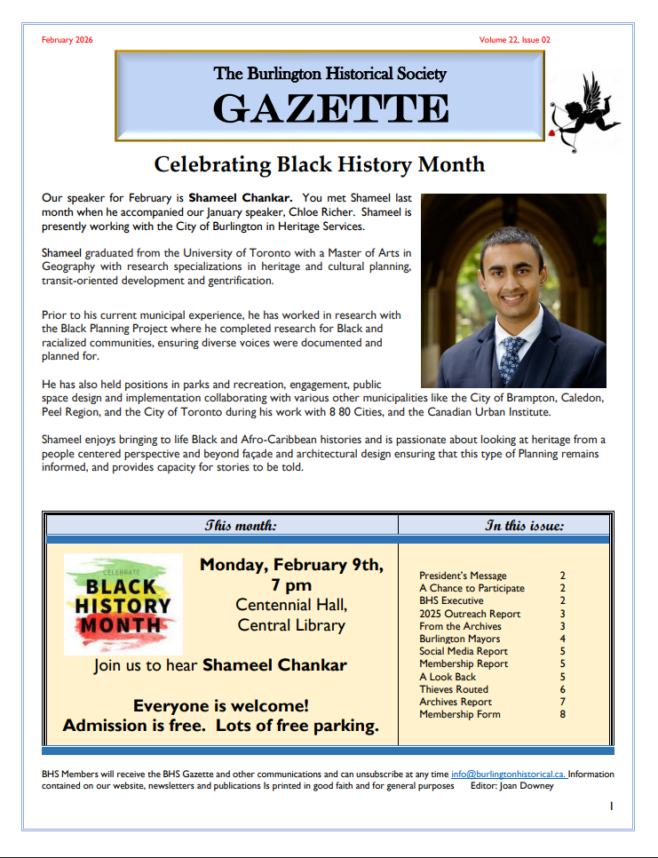 The Burlington Historical Society (BHS) is a registered charity, founded in 1899 and has been serving the community for over 50 years as an affiliated member of the Ontario Historical Society. Our Mission: preserve and share Burlington’s past for the